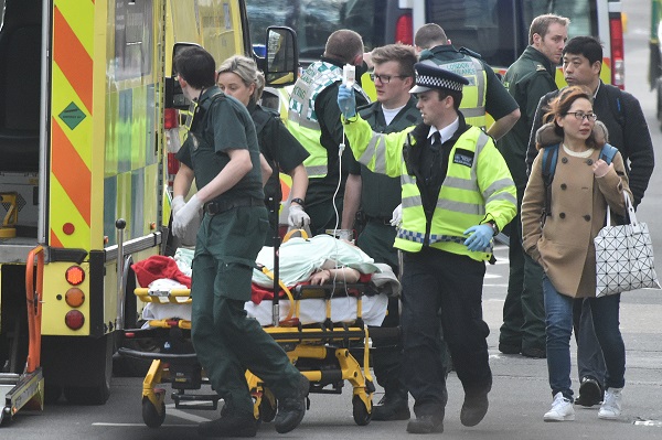 Four people have been killed, including the stabbed officer and a male terrorist, and at least 20 injured in an