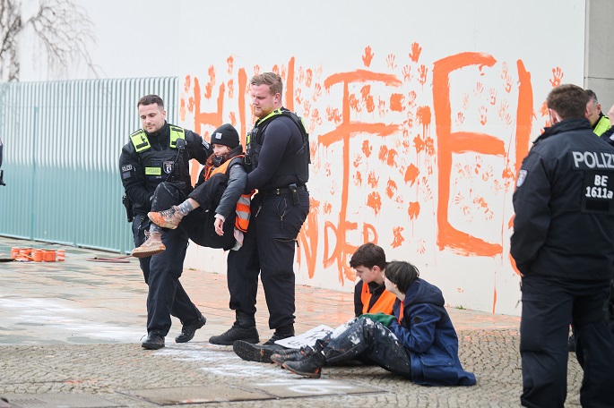 Members of the Last Generation climate activism group daubed orange paint onto the façade of the German chancellery on Saturday