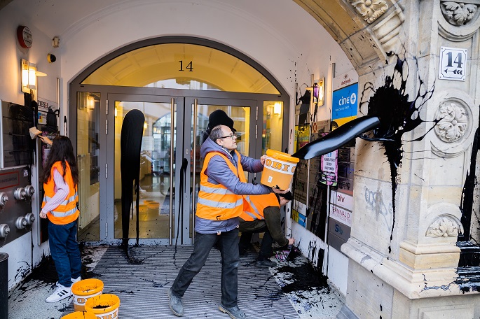 German climate activists from the Last Generation group poured an oil-like substance into the entrance of the headquarters of the