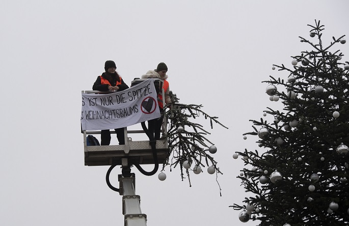 Climate activists sawed off the top of the Christmas tree in front of Berlin's Brandenburg Gate on Wednesday, reported dpa. Activists