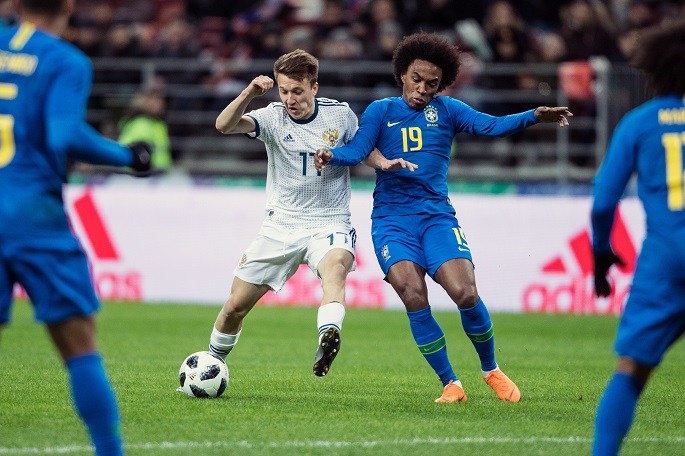 Barcelona pair Philippe Coutinho and Paulinho struck late goals as Brazil recovered from a slow start to beat Russia 3-0