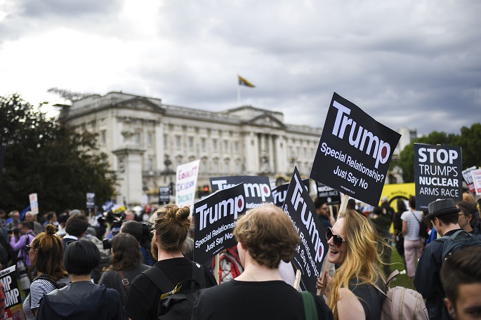 U.S. President Donald Trump was greeted with a royal family welcome and protests after he arrived in London on Monday