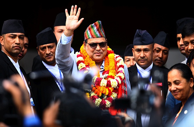 Krishna Bahadur Mahara (C), a leader of the ruling Communist Party of Nepal (Maoist Center), waves as he was elected