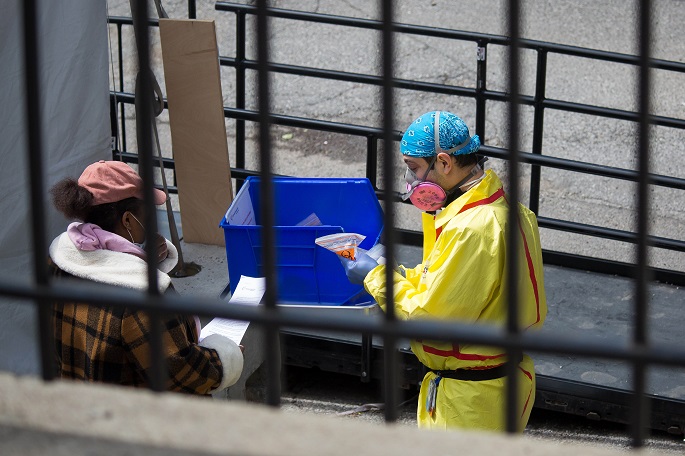 Healthcare workers wheel a patient into the emergency room at Brooklyn Hospital Center during the coronavirus pandemic in the Brooklyn
