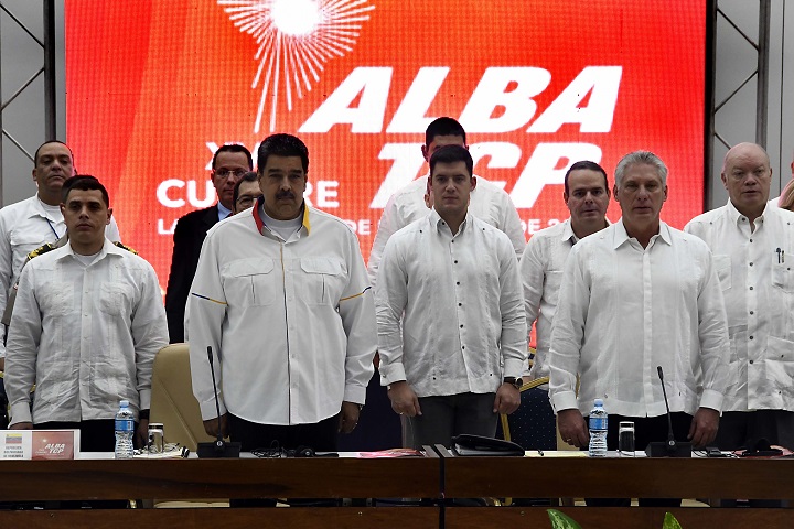 Cuban President Miguel Diaz-Canel (R front) talks with Venezuelan President Nicolas Maduro (L front) during the 17th Summit of the