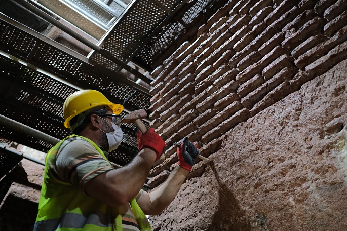 "We started the entire process by conducting some scrapper activities and removing cementitious elements," Ozel talked about the details of the restoration works. "Currently, there is a grouting opening activity in brick pillars. The original bricks have been reached on the floors, and their conservation work is being done."
